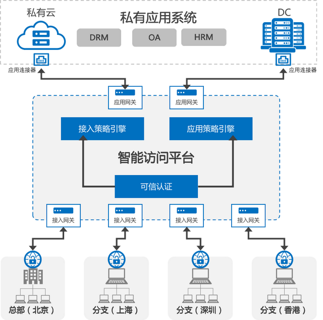 私有应用:支持云上和线下数据中心或私有环境内的私有应用系统,只需要部署一个应用连接器。