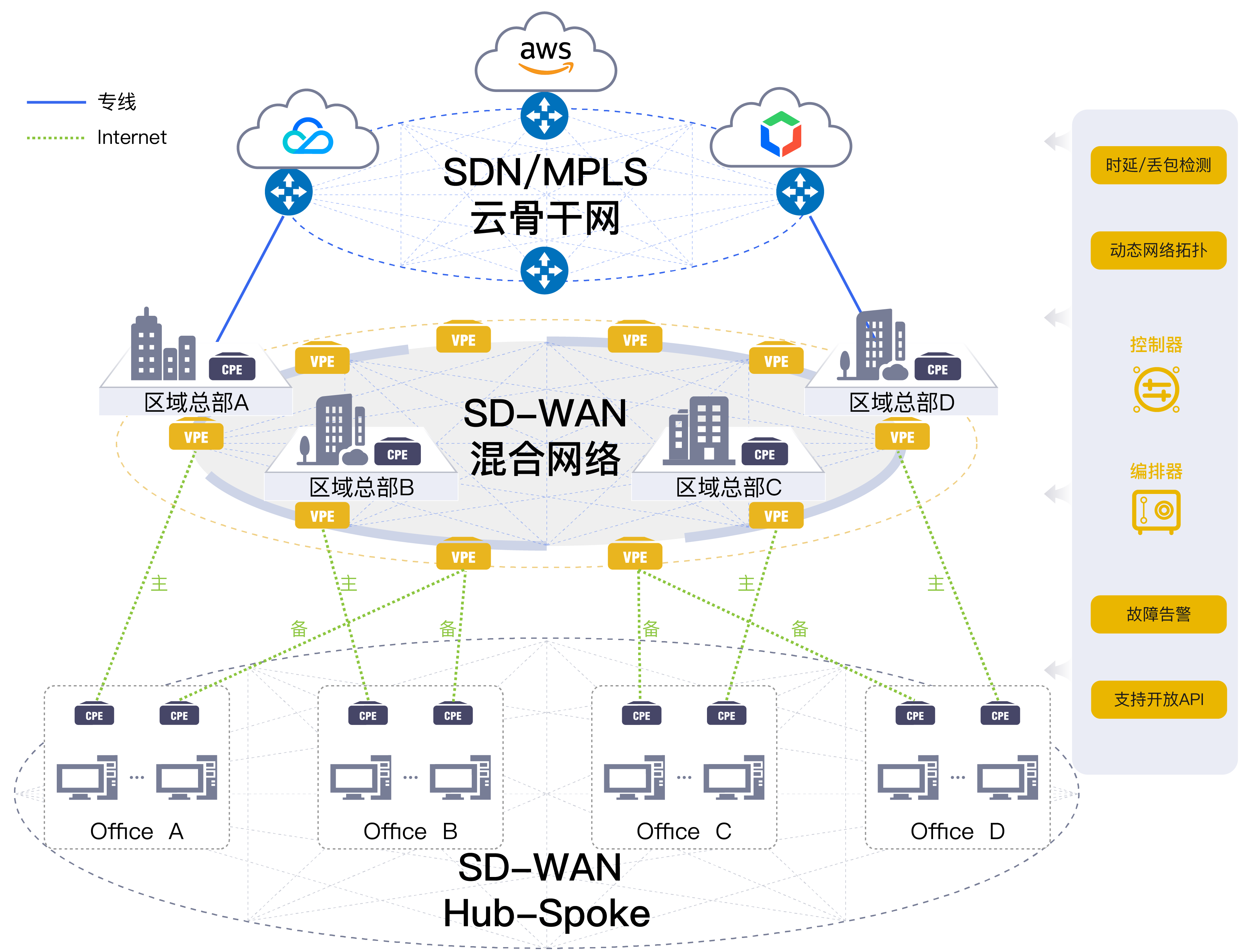 - 第三层:利用SD-WAN的Hub-Spoke组网模式,即纯公网模型,用于区域内海量多分支与区域总站之间的互联。在每个区域总站部署一个HUB站点,区域总站与总站之间,包括区域总站与所有分支站点,均采用公网互联。由于没有MPLS成本还可以进一步降低,虽然以公网承载,但SD-WAN有广域网及路径优化技术,专用加密隧道保障安全性,其网络质量和安全性与专线较接近,同时成本更低,更灵活,更快速部署。