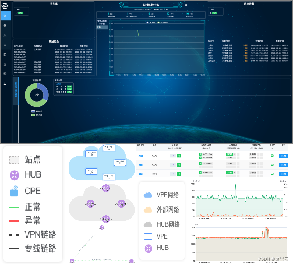通过犀思云的Hybrid WAN管理平台,可将融合了不同链路类型的三层网络统一管理,同时三层业务的网络相互隔离,互不影响。通过统一的管理平台,可以实时监控链路及设备的时延、丢包、流量等状态。当发生故障时,可通过短信、邮寄、钉钉三种方式发出报警,同时快速定位问题,极大提升网络运维效率,降低企业总部运维成本。