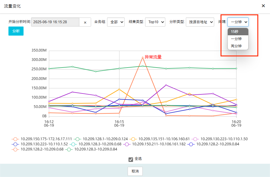 但借助流量分析功能,运维人员第一时间打开流量趋势图,发现某一分钟内流量陡然升高。点击该时间点,系统自动跳转至分钟级详细分析视图,多条业务流清晰展示在图表中,包括源IP、目的IP、端口及流量变化曲线。