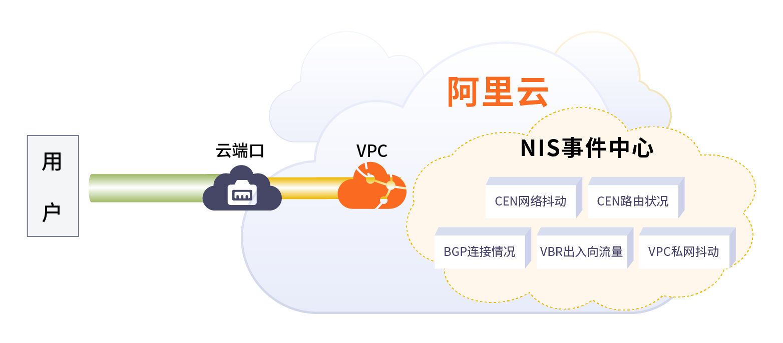 更进一步,我们集成了阿里云NIS的事件中心能力,实现了对云上CEN网络抖动、路由状况,BGP连接情况、VBR出入向流量情况及VPC私网抖动信息的获取。帮助客户在复杂的云网环境中更快速地识别云侧网络异常来源,缩短故障定位与处置时间。