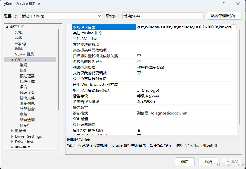为了利用C语言标准库中的<stdarg.h>来进行可变参数的处理,我们需要包含对应的驱动开发CRT(C Run-Time)库。以Visual Studio为例,我们应当在项目的“c/c++”配置选项中的附加包含目录里导入特定的路径,比如“D:\Windows Kits\10\Include\10.0.26100.0\km\crt”。请根据实际情况对上述路径进行相应的修改。