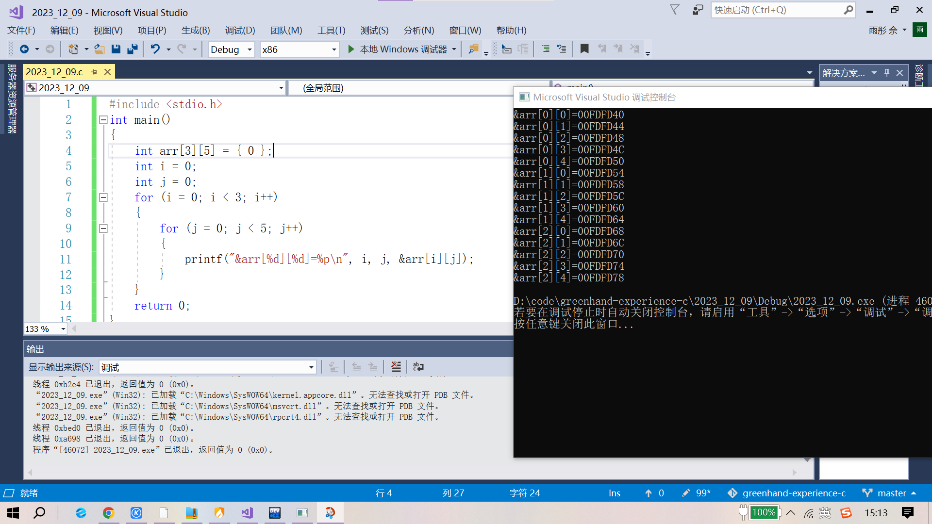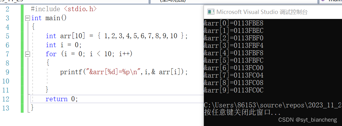 数组随下标的增长,地址是有小到大变化的,并且我们发现每两个相邻的元素之间相差4(因为一个整型是4个字节)所以,数组在内存中是连续存放的