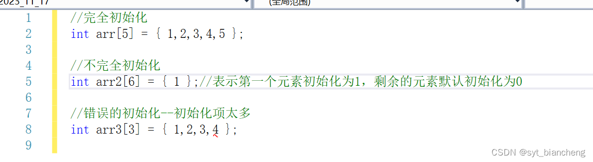 - 不完全初始化:int arr1【3】【4】={1,2};