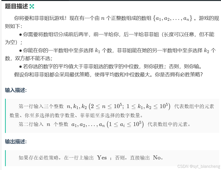 - 易错点:(1)是第一个人在分这个数组,所以对他最有利的分发一定是给自己的数组中所包含的数越多越好,因此我们确定分数组的方法为n-1:1;(2)"至多"为k1和k2,说明了最优策略为平均数找n-1中的最大值,中位数为最后给他剩的那一个数;(3)注意:划分也是属于最优策略的一部分;那么以上就是我们的划分部分(4)至于判断是否存在必胜策略,那只要最后一个数不是最大的话,那“我”一定赢。