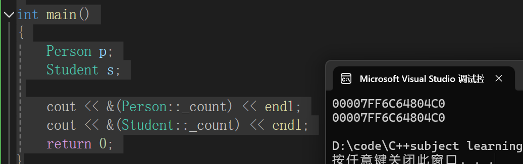 如上图所示,Student继承了父类的静态成员_count,则子类与父类的_count是同一个,地址相同。