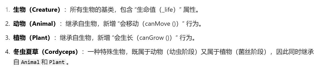 菱形继承:如下面的例子,冬虫夏草只有一个_life属性,因此会产生数据冗余和二义性的问题