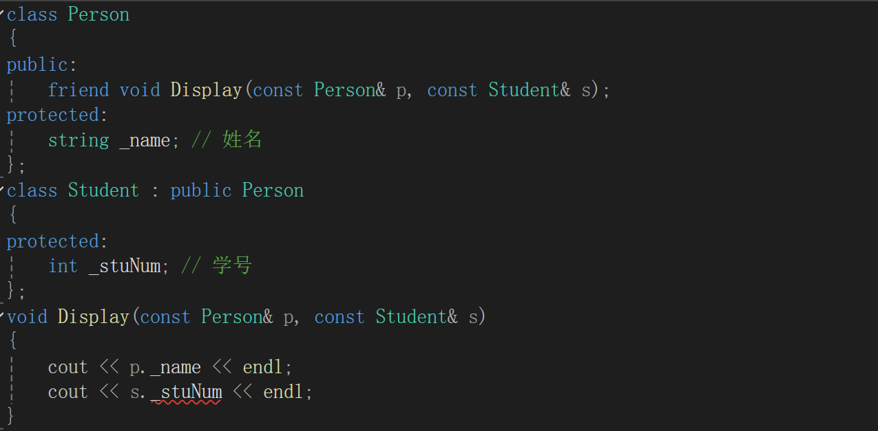 如上图所示,Display()函数是父类Person的友元,能够在类外访问父类的protected对象_name;而不能访问子类的preotected成员_stuNum