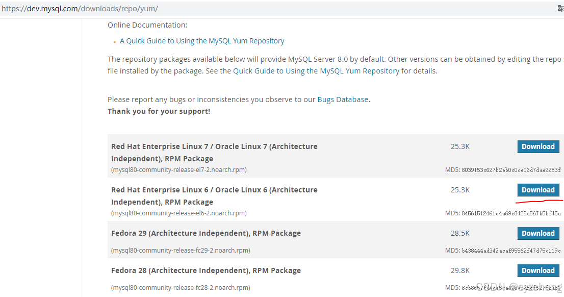 访问页面https://dev.mysql.com/downloads/repo/yum/,下载MySQL Yum存储库 。