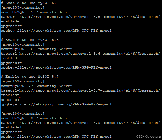 在mysql-community.repo文件里面定义要安装的版本。因为我是要安装MySQL5.7,所以把5.7的enabled由0改为1,同时将8.0的由1改为0。(默认是安装最新版8.0)