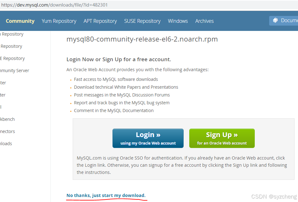 把鼠标放到No thanks, just start my download.,右键复制链接地址。(我这里是https://dev.mysql.com/get/mysql80-community-release-el6-2.noarch.rpm)