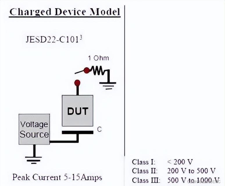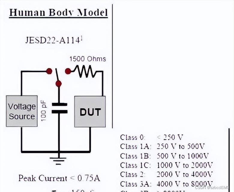 该模型表征人体带电接触器件放电,Rb 为等效人体电阻,Cb 为等效人体电容。等效电路如下图。图中同时给出了器件 HBM 模型的 ESD 等级。