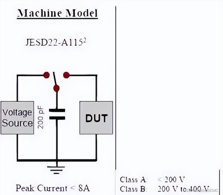 机器模型的等效电路与人体模型相似,但等效电容(Cb)是 200pF,等效电阻为 0,机器模型与人体模型的差异较大,实际上机器的储电电容变化较大,但为了描述的统一,取 200pF。由于机器模型放电时没有电阻,且储电电容大于人体模式,同等电压对器件的损害,机器模式远大于人体模型。