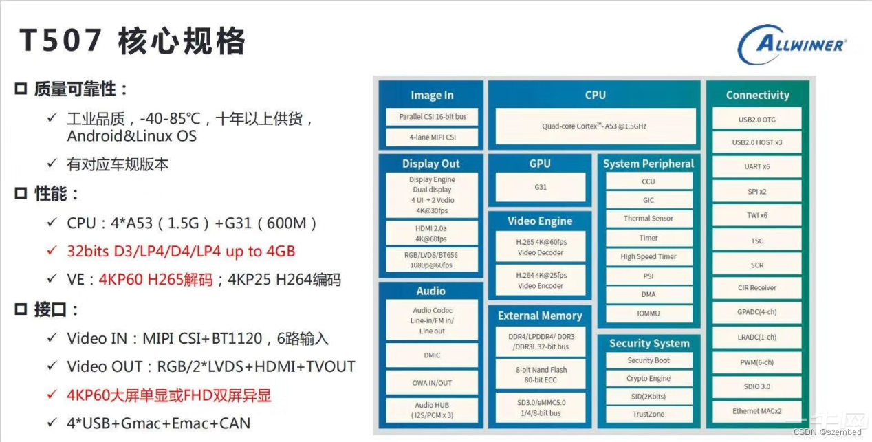 - 采用Allwinner公司Cortex-A53四核T507车规级处理器,运行最高速度为1.5GHZ;