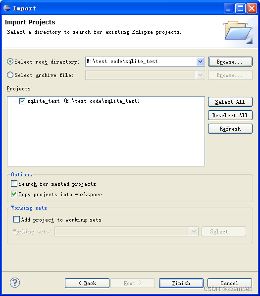 c、点击Select root directory右侧的Browse打开已有的eclispe工程,如需要将该工程复制到当前的Workspace下,则勾选Copy projects into workspace。然后点击Finish即完成已有工程导入。