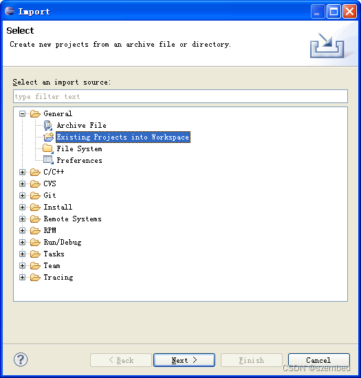 b、选择Existing Projects into Workspace,点击Next继续。