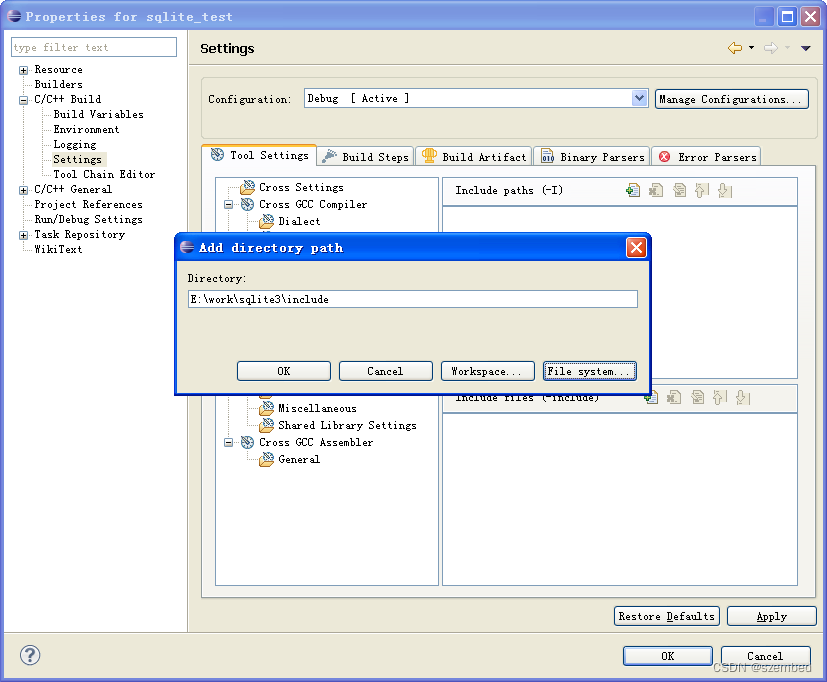 b、添加头文件目录:选中Cross GCC Compiler的Includes,在右侧的Include paths (-l)中点击