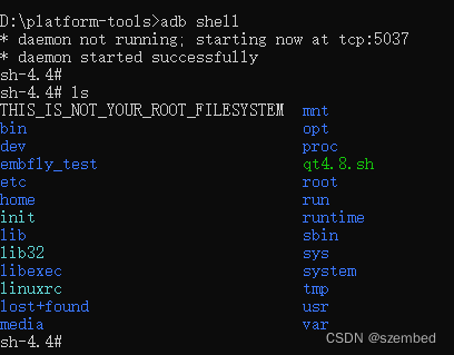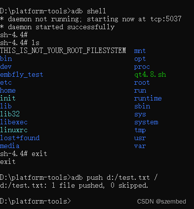 出现”daemon started successfully”,表示工作正常。同时输入ls指令可以看到主板根文件系统中的相关文件。