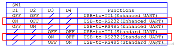 KIT-CP2105支持RS232模式和RS485模式,如上示例图片中的设置是:两个串口都处于RS232模式(见上图中SW1的拨码位置)。如设置为RS485模式,那么SW1-1和SW1-3拨OFF,SW1-2和SW1-4拨ON,也可以分别设置。具体见下图:
