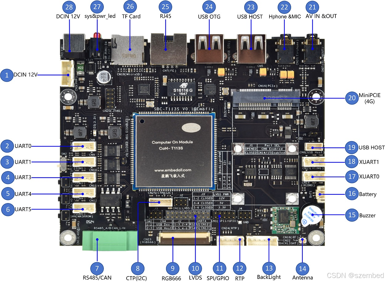 SBC-T113S主板主板支持7路RS232串口,5个是处理器内置串口(其中一个暂定为调试串口,位号是CN10,节点是ttyAS3),另外2个是通过USB扩展出来的串口(CN14&15),它们在主板上的位置如下图: