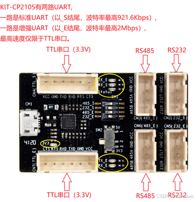 KIT-CP2105具备两个串口,其中一个是标准串口,最高波特率是921600bps(仅限TTL串口);另外一个是增强型串口,最高波特率是2Mbps(仅限TTL串口)。这里强调仅限于TTL串口是因为波特率还受到RS232或者RS485电平转换的制约。例如: SP3232EEY只能做到最高250Kbps。