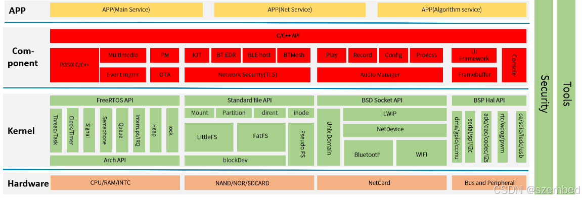 • Kernel:内核层包括 FreeRTOS核心系统、文件系统、网络系统、BSP驱动等。