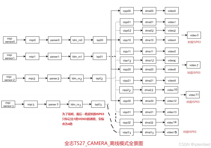 - 和在线模式一样,某一路sensor数据经过ISP处理后,分为4路输入到相应的vipp、dma和video中,4路sensor数据所以共有16路,video0/4/8/12为sensor0数据,video1/5/9/13为sensor1数据;