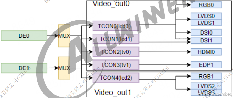 以下将直接展示 MIPI 屏配置的相关设备树节点,不再详细介绍 MIPI 屏本身如何适配。如果只配置一路就是单显,配置两路就是双屏异显。T527 有两个 DE,至多支持双显。