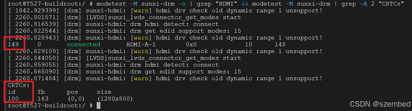 查看hdmi connector id和crtcs id: