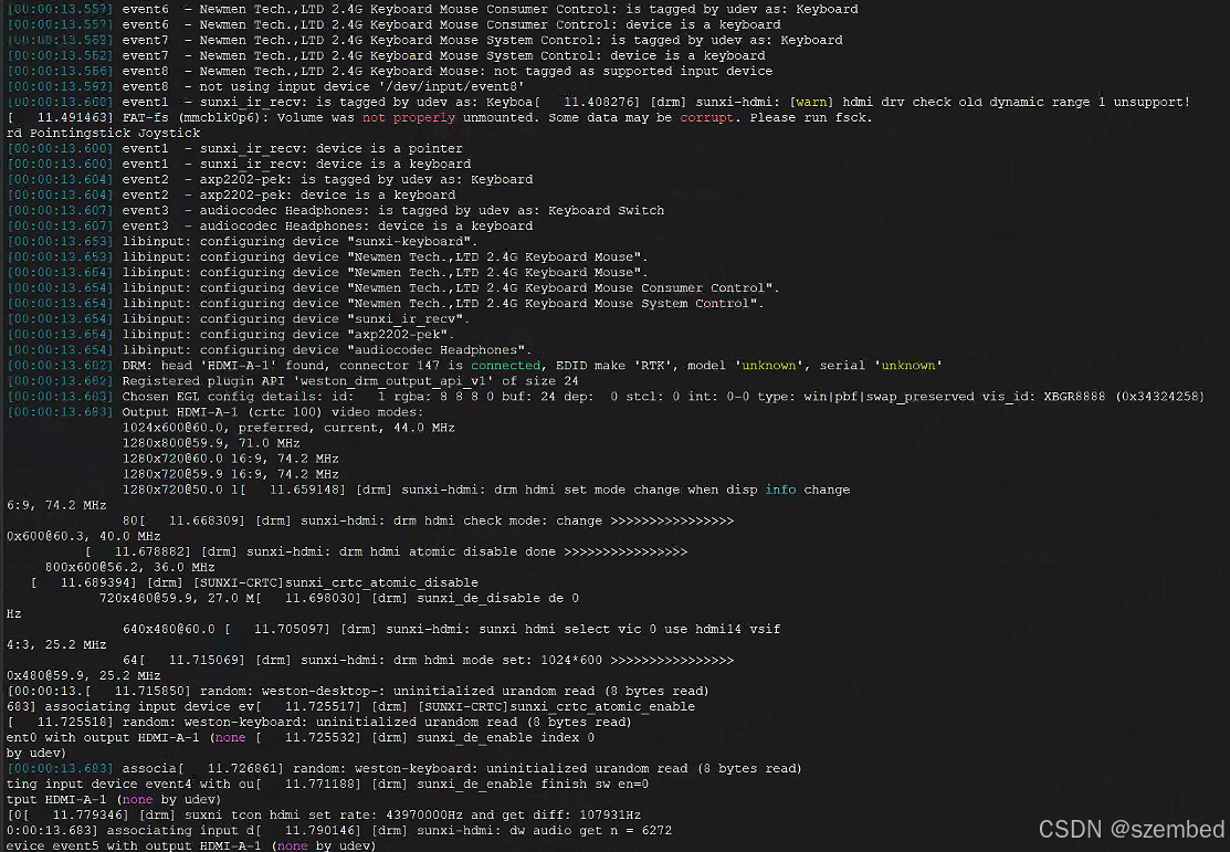 以下是sdk出厂时关于hdmi的默认配置,可以直接用。需要修改可以参考《Linux HDMI2.0 DRM 开发指南》。同时需要关闭lvds。(如果不关lvds,系统启动后不会自动进入weston桌面。不会自动进入weston桌面不代表hdmi无法使用):