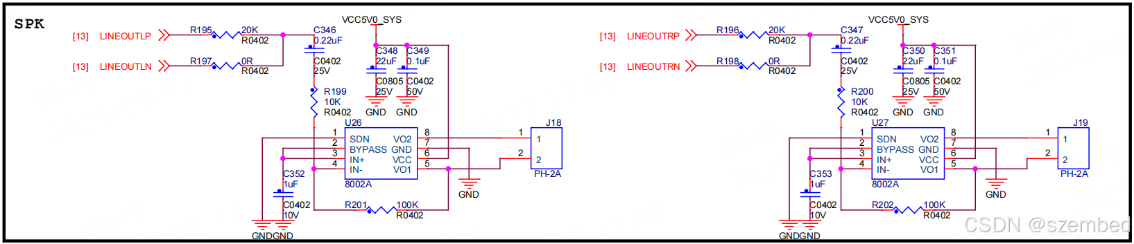 该t527板卡引出2路单声道扬声器接口。1路喇叭使用LINEOUTLP/N,1路喇叭使用LINEOUTRP/N: