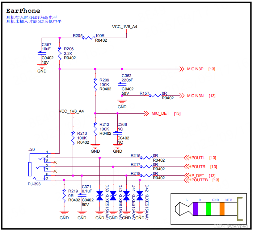 - 输出:1路耳机接口输出(HPOUTL/R)、2路差分线路输出(LINEOUTLP/N、LINEOUTRP/N)