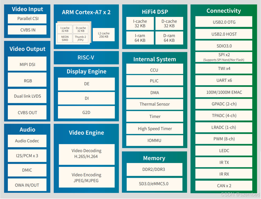 - 高性能低功耗,集成4核Arm Cortex-A7,频率最高1.6GHz,并集成RISC-V XuanTie E907、ISP图像处理、G2D图形加速等多个计算单元