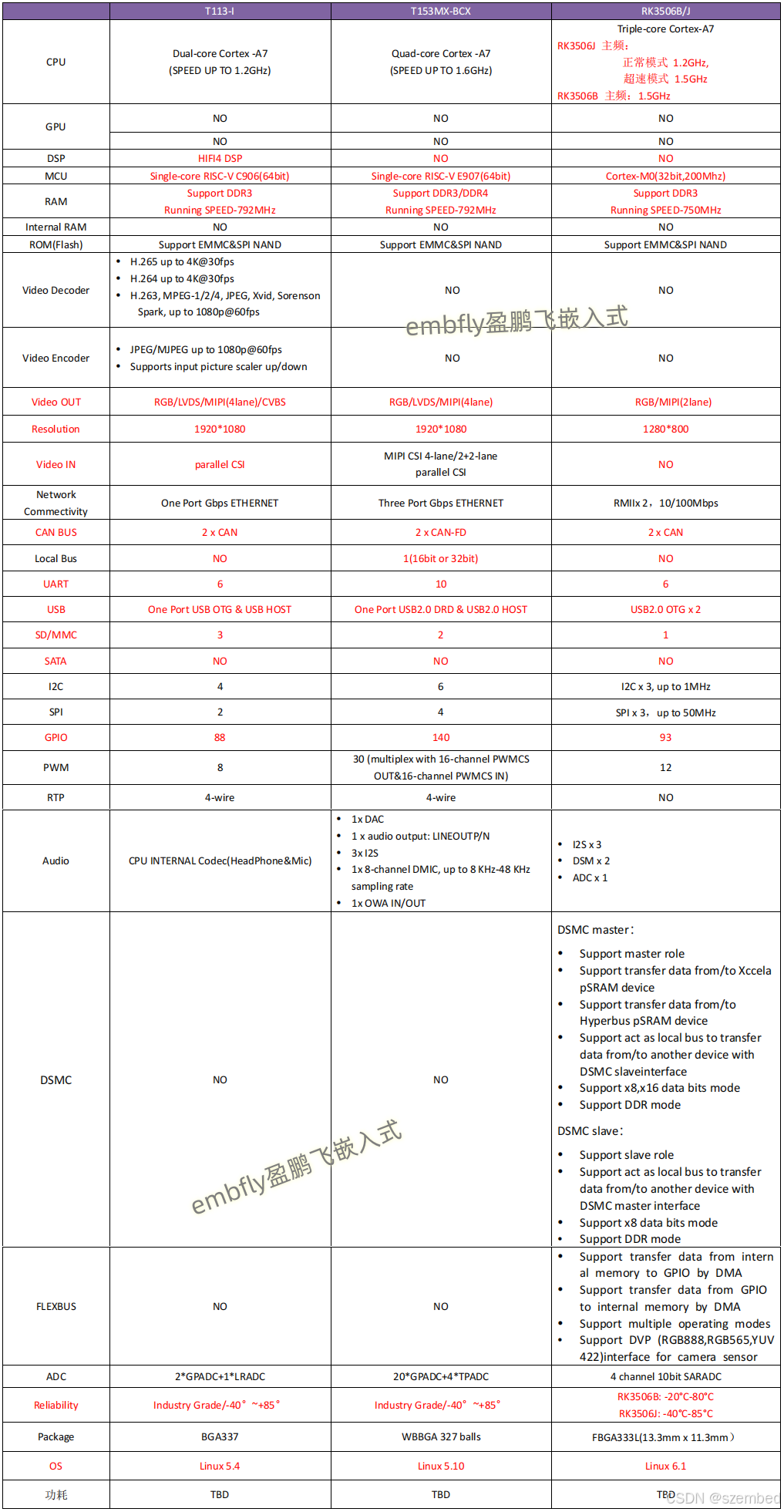6)T113是不支持Localbus的,而T153和RK3506都支持总线,只是名字不太一样,T153叫Localbus(最大支持32位),而RK3506支持DSMC总线;两者都可以扩展FPGA。