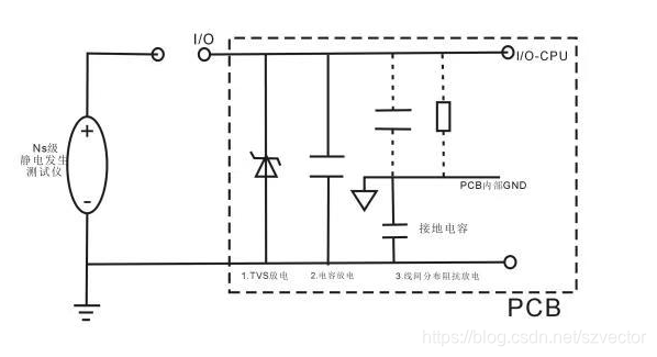 防治方法:接地,把所有的地共到一起(交流接地也算共地),加TVS、加电容泻放,使静电导到大地。