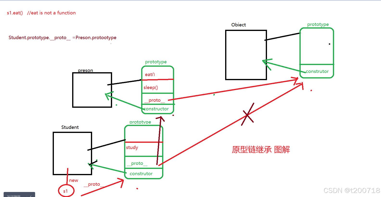 __proto__去它的显式原型里面找eat方法,没找到,然后通过原型链:逐级向上,就近原则,在它的prototype里通过__proto__去找到Object的显式原型里,还是没有,如果在Object的prototype里在通过__proto__去找,就是null了 所以直接s1.eat()0会报eat is not a function的错