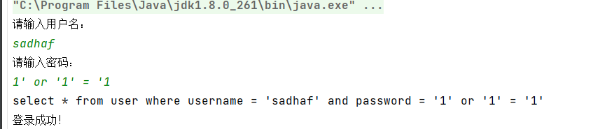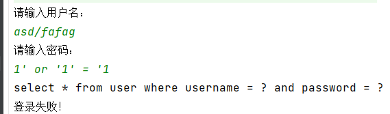 这里的输入使用‘’将select * from user where username = '" + username + "' and password = '" + password + "' 中的单引号吸附将语句的条件转变,这是一种很危险的操作。