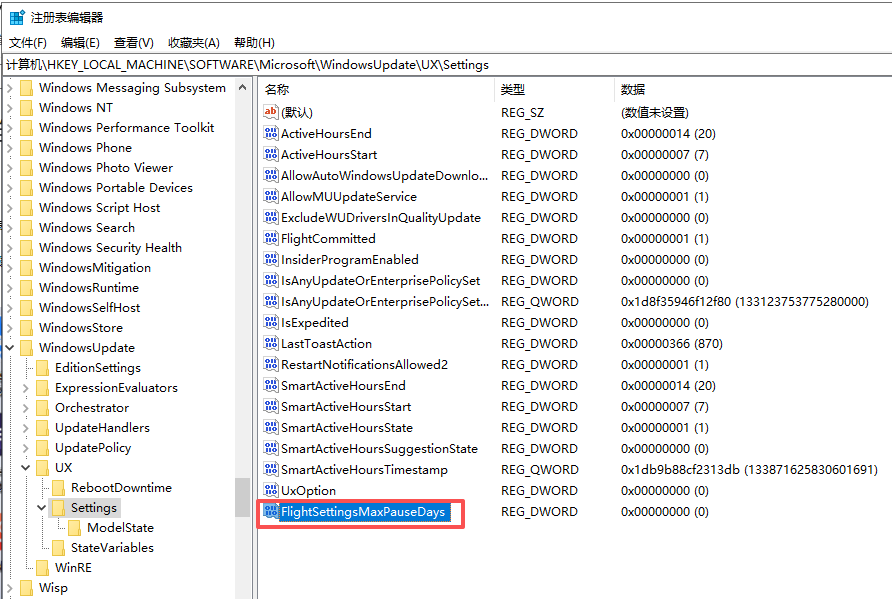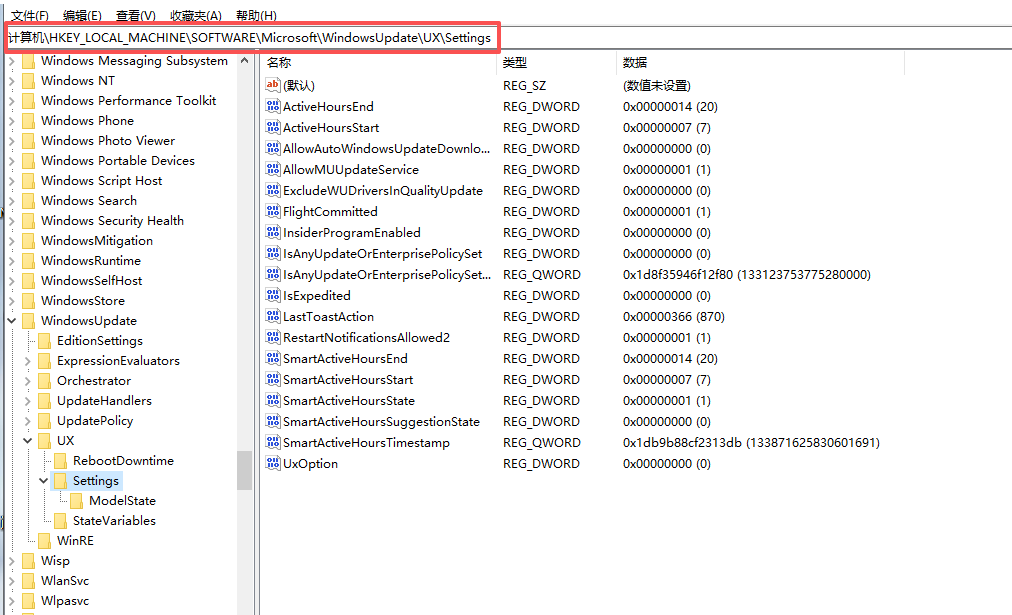 2、找到 计算机\HKEY_LOCAL_MACHINE\SOFTWARE\Microsoft\WindowsUpdate\UX\Settings 目录