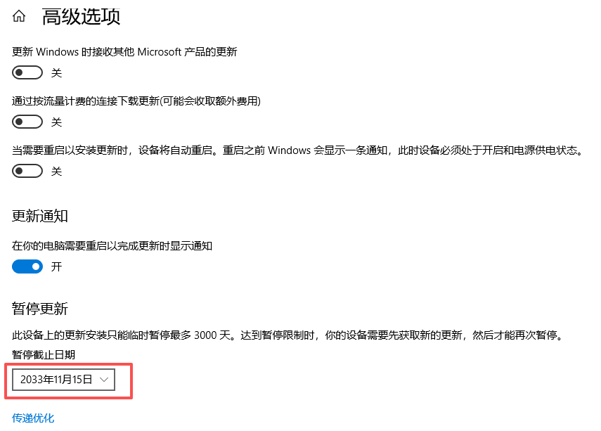 8、“暂停更新”处,点击下拉框,拉到最下面,选择最后一个时间,至此,暂停系统自动更新设置完成