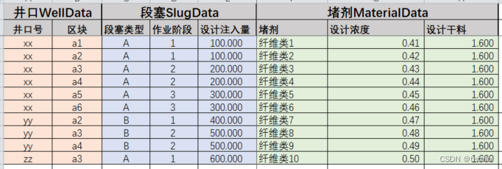 理想情况下我们希望的Excel数据输入如下图所示,代码也将允许重复数据输入并进行存储。代码最终的存储结构将会是一个List<ExcelImportBean>的井口列表形式,每一个ExcelImportBean中将包含段塞列表List<Slug>,每一个段塞Slug中将包含堵剂列表List<Material>