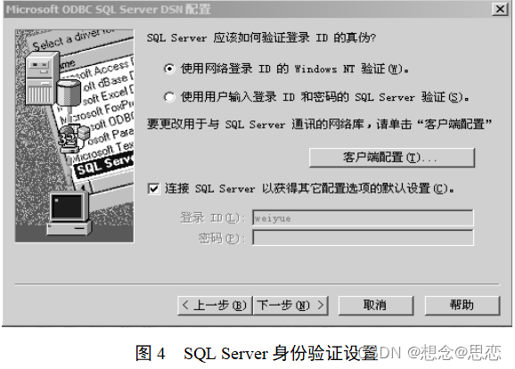选择 “下一步”按钮,点击“使用用户输入登录ID和密码的SQL Server验证”单选按钮,“登录ID”默认为“admin”,密码为空。如图4所示。