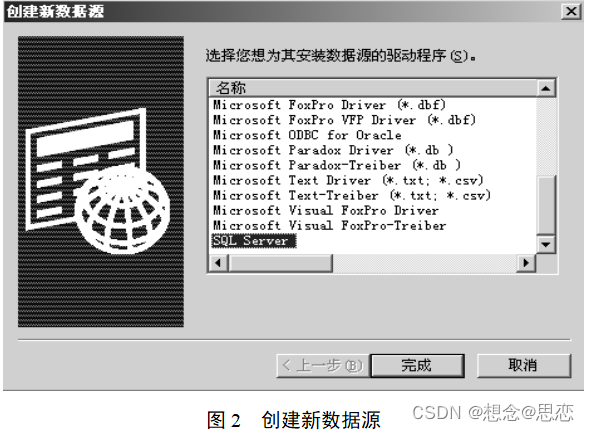 在弹出的“ODBC数据源管理器”的窗口中选择“系统DSN”,之后点击“添加”选项,选择“SQL Server”为数据库驱动程序,点击“完成”。如图2所示。