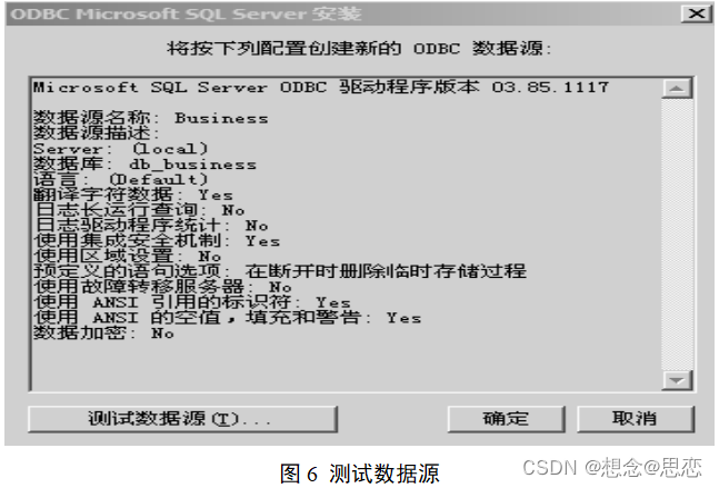 点击“下一步”按钮,再点击“完成”按钮即可打开“ODBC Microsoft SQL Server 安装”对话框。如图6所示。