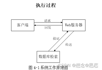 本系统采用B/S结构(Browser/Server,浏览器/服务器结构)和基于Web服务两种模式,是一个适用于Internet环境下的模型结构。只要用户能连上Internet,便可以在任何时间、任何地点使用。系统工作原理图如图4-1所示: