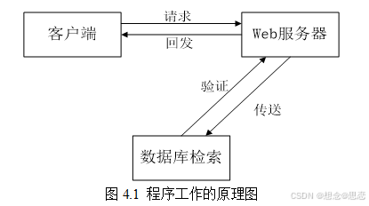 本次拟开发的系统为了节约开发成本,也为了后期在维护和升级上的便利性,打算通过浏览器来实现系统功能界面的展示,让程序软件的主要事务集中在后台的服务器端处理,前端部分只用处理少量的事务逻辑。下面使用一张图(如图4.1所示)来说明程序的工作原理。
