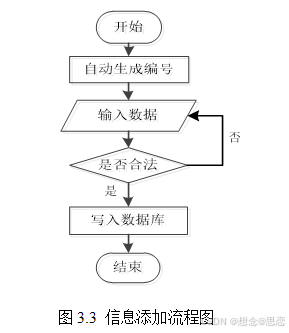 程序的添加功能就是提供给操作者录入信息的功能,不管是涉及到用户信息添加,还是其它功能模块涉及到的信息添加,程序的信息添加流程(如图3.3所示)都是一致的。程序都是先对操作者录入的数据进行判定,这个判定规则是一段提前编写完成的程序代码,当程序判定数据符合要求时,才会把操作者录入的数据登记在数据表里面,比如添加的用户信息,就会把新添加的用户信息写入用户信息的数据表文件里面。