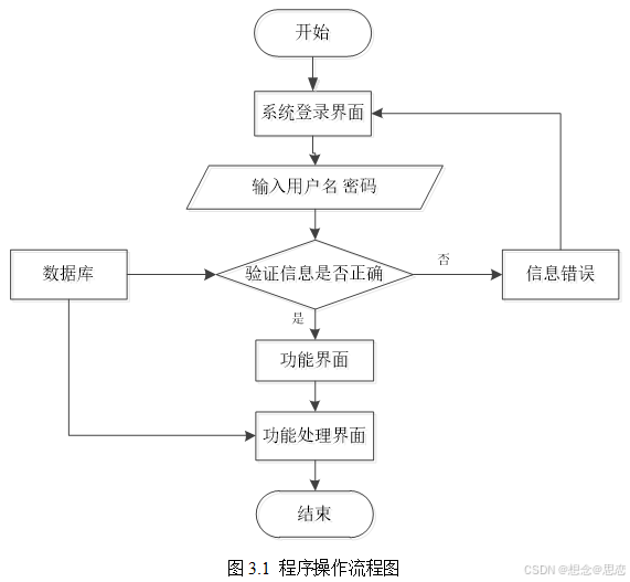 程序上交给用户进行使用时,需要提供程序的操作流程图(如图3.1所示),这样便于用户容易理解程序的具体工作步骤,现如今程序的操作流程都有一个大致的标准,即先通过登录页面提交登录数据,通过程序验证正确之后,用户才能在程序功能操作区页面操作对应的功能。