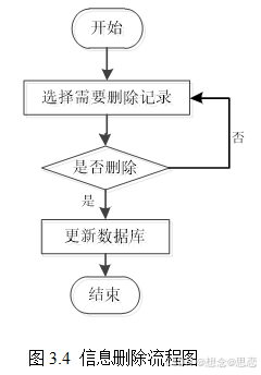 当从程序里面删除某种无效数据时,遵循程序的信息删除流程(如图3.4所示),先要选中操作者需要删除的数据,程序为了预防操作者误删信息,也会进行提示,当操作者真正确定要删选中的信息时,该信息就会从数据库中被永久删除。