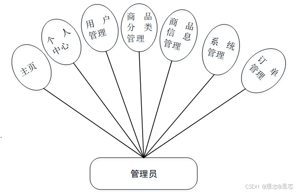 管理员登录后可进行主页、个人中心、用户管理、商品分类管理、商品信息管理、系统管理、订单管理,管理员的用例如图3-1所示。