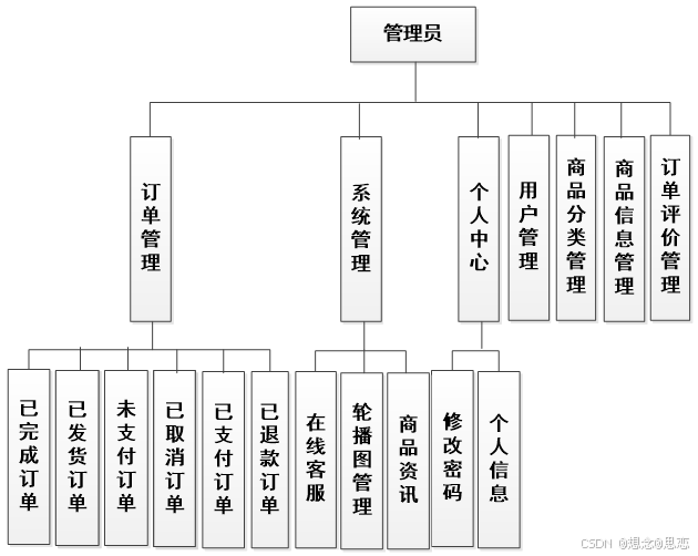 设计的管理员的详细功能见下图,管理员管理不同状态的订单,管理商品和用户,审核订单评价。
